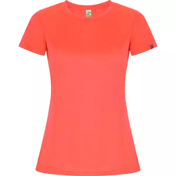 Le t-shirt Imola Woman est fabriqué en 50 % polyester recyclé, 50 % polyester, tissu interlock CONTROL DRY, 135 g/m². Coupe ajustée femme, manches raglan, col rond avec surpiqures ton sur ton, panneaux inférieurs sur les manches. Étiquette ECO amovible sur la manche, emballage en matériau recyclé. Léger, respirant, séchage rapide.
